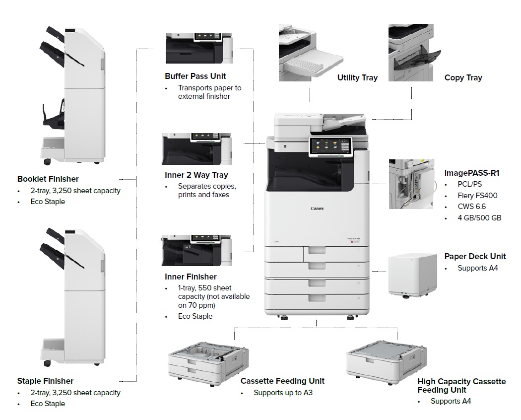 The Canon iR-ADV DX C58xx Range are able to achieve print speeds of 40 to 70ppm(A4) due to their advanced features such as 5-line LCD touch panel, mobile connectivity, cloud connectivity and duplex print. In addition, they support media size up to A3+ (329x483mm), making them ideal for a variety of printing needs.